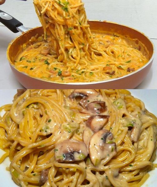 Spaghetti met champignons uit de pan, iedereen vraagt ​​om dit recept!