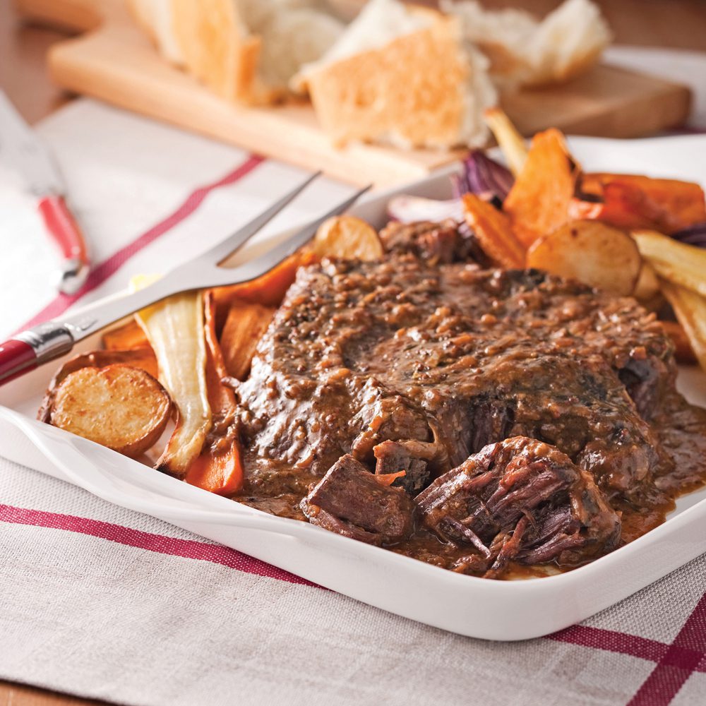 Ingrediënten 30 ml (2 eetlepels) volkoren mosterd 30 ml (2 eetlepels) Dijonmosterd 1 zakje uiensoepmix (55 g) 60 ml (1/4 kopje) zachte boter 10 ml (2 theelepels) verse, fijngehakte tijm of 5 ml (1 theelepel) gedroogde tijm 15 ml (1 eetlepel) koolzaadolie900 g (2 lb) ontbeend runderstoofvlees