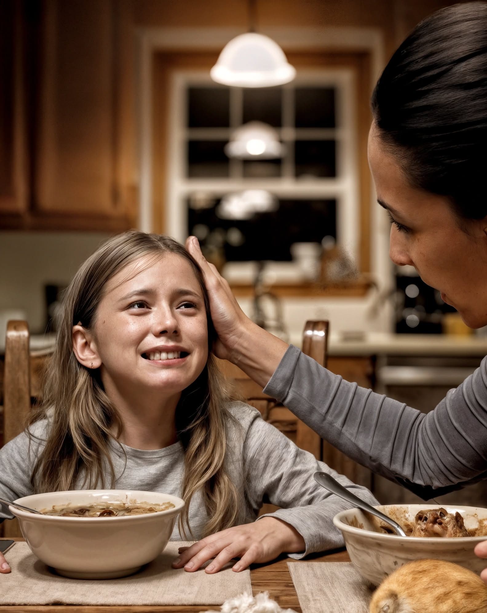 Terwijl mijn zus op zakenreis was, paste ik op mijn vijfjarige nichtje. Ik serveerde haar runderstoofpot als avondeten, maar ze raakte geen hap aan. Toen ik vroeg waarom, fluisterde ze: « Mag ik vandaag wel eten? » Op het moment dat ik haar geruststelde met « Ja, natuurlijk, » barstte ze in tranen uit.