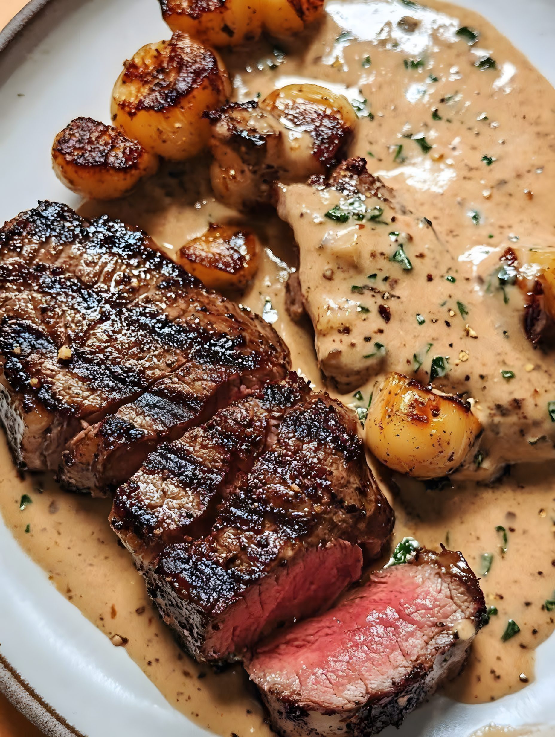 Deze sappige ribeye steak met een rijke, romige bourbon-knoflooksaus is een ware smaakexplosie! De boterzachte biefstuk wordt perfect gebakken en gecombineerd met een fluweelzachte saus met whisky, room en Dijonmosterd. 😍