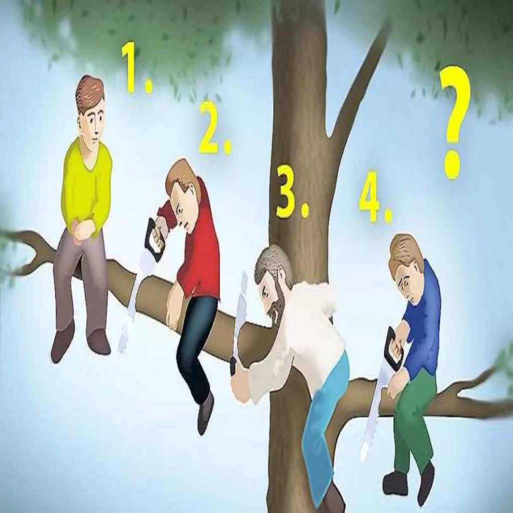 Deze afbeelding toont een boom met twee takken aan weerszijden, waaraan vier mensen zich vastklampen. Drie van hen hebben een zaag in hun handen en zijn bezig delen van de tak af te zagen. De vierde man, uiterst links, zit vredig aan het uiteinde van de tak, met zijn handen op zijn benen. Deze mensen lijken het zich niet te realiseren, maar ze brengen zichzelf in gevaar door de plek die ze hebben uitgekozen om de tak af te zagen.