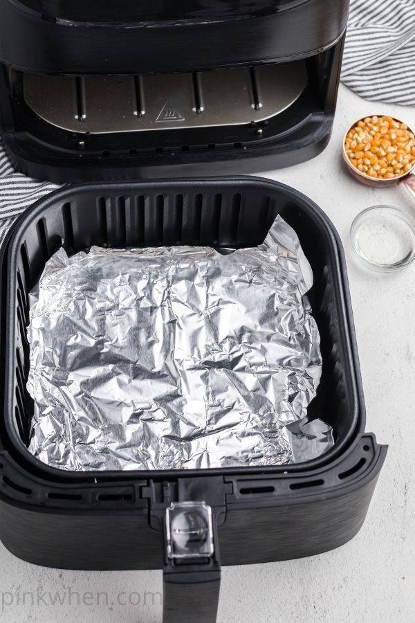 Leg de popcornkorrels in een enkele laag op de folie in het mandje van de airfryer.