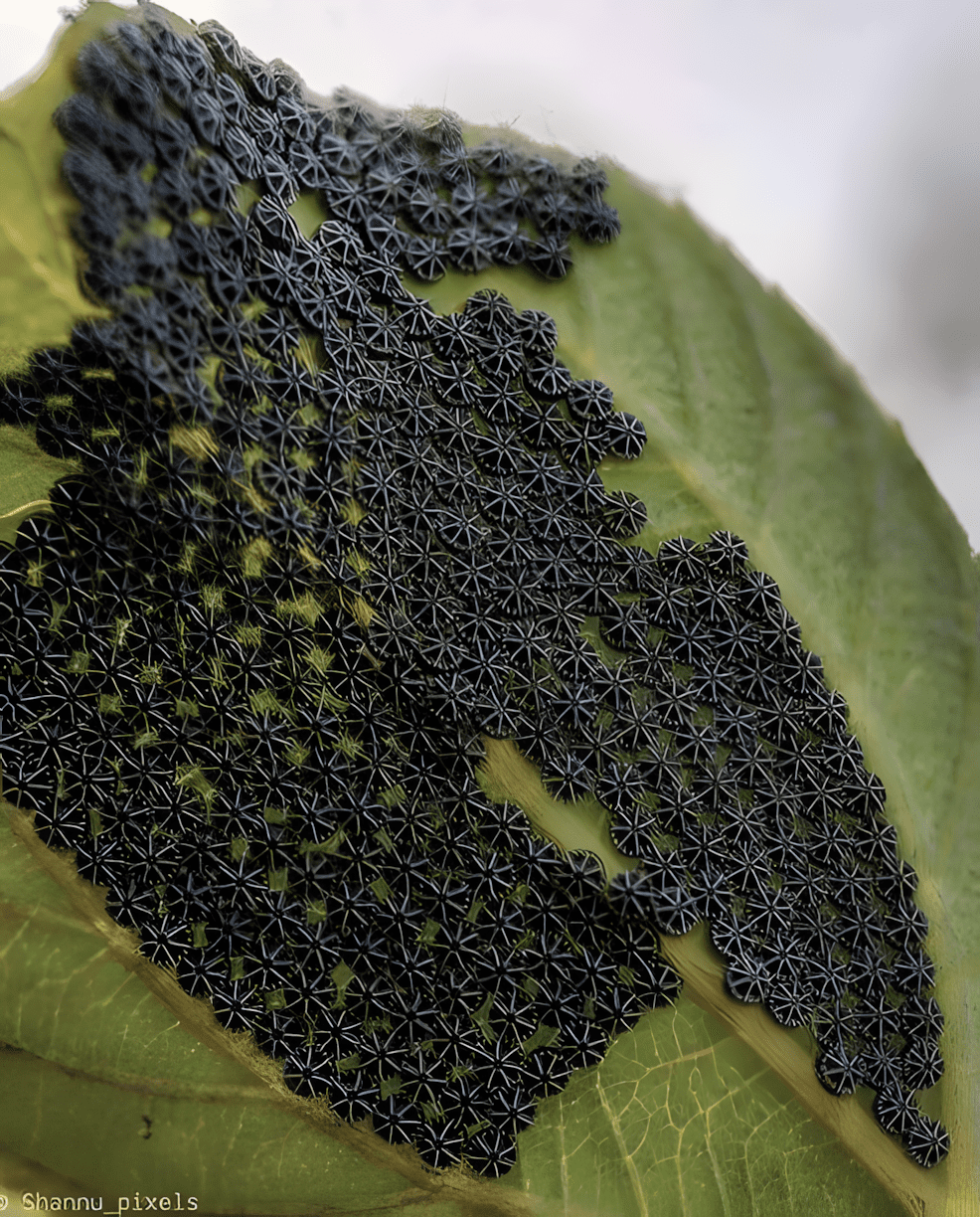 Deze ingewikkelde eieren lijken op fijn zwart kantwerk dat over de bladeren is uitgespreid, in clusters gelegd, waarbij elk klein eitje een perfecte geometrische vorm heeft.