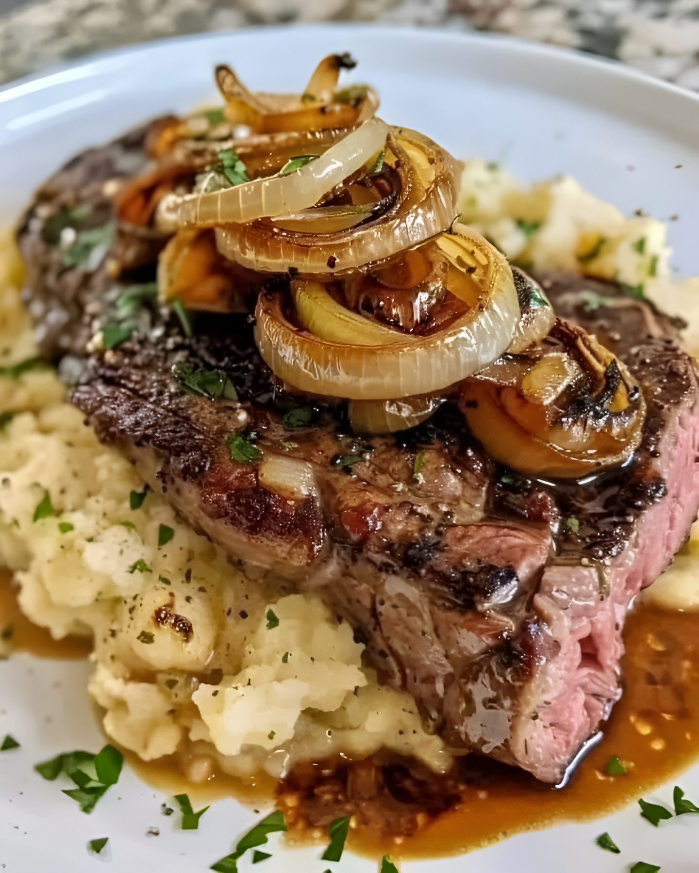 Ribeye Steak met Gekarameliseerde Uien en Aardappelpuree