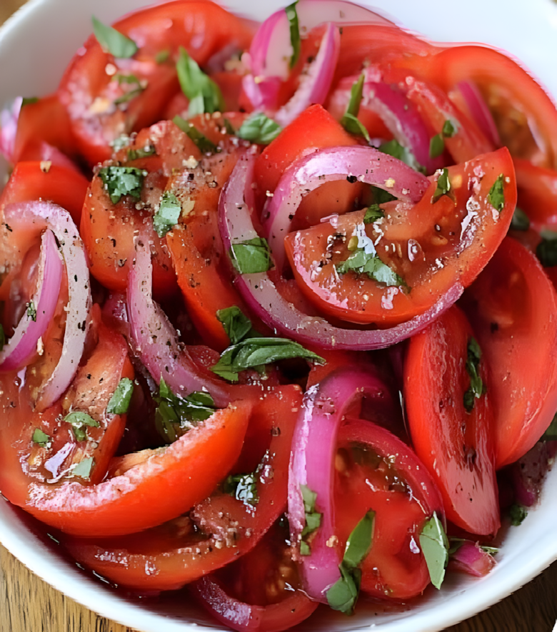 Deze salade van tomaat en rode ui met basilicum is de ultieme zomerse klassieker: fris, licht pittig, vol natuurlijke sappen en boordevol smaak. In slechts 10 minuten maak je een kleurrijk gerecht dat perfect past bij barbecue, pasta, gegrilde vis of gewoon als lichte lunch. Ideaal voor wie houdt van eenvoud en puurheid in de keuken!