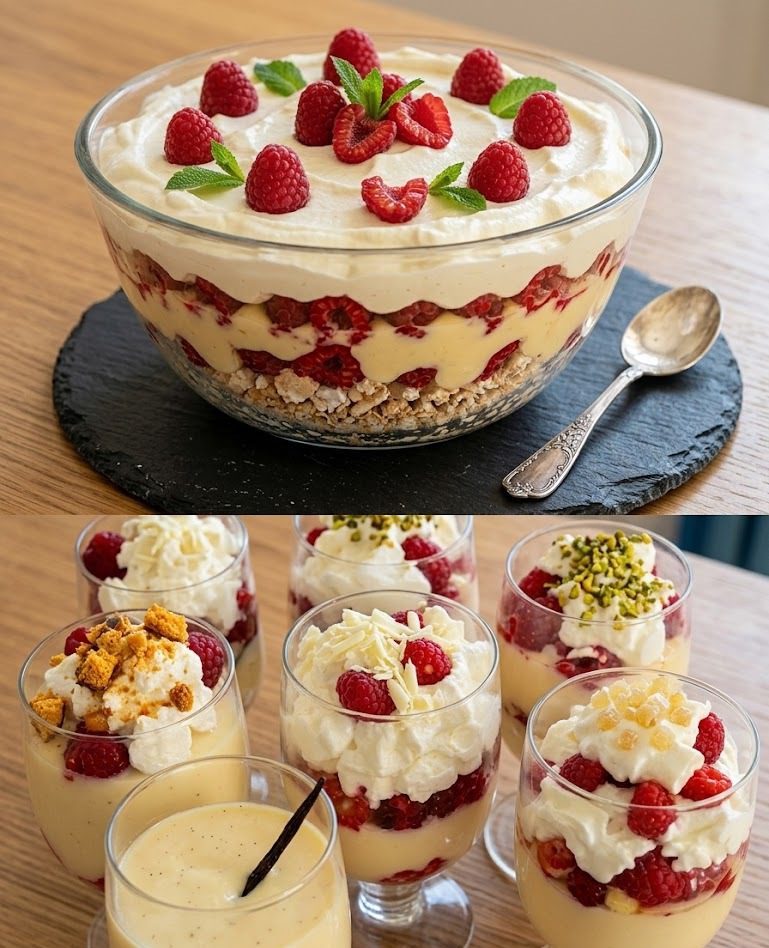 Dit dessertrecept belichaamt de perfecte combinatie van eenvoud en elegantie. Met zijn prachtige lagen van romige mousse, frisse frambozen en knapperige meringue, lijkt deze trifle wel een kunstwerk. Het is een “3-minuten dessert” zodra je de ingrediënten hebt voorbereid, en het resultaat is een luchtige traktatie die smelt op je tong. Ideaal om een maaltijd mee af te sluiten!