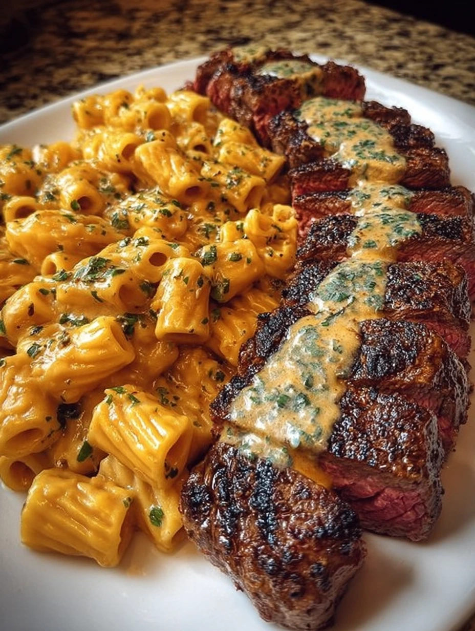 Dit is zo’n diner waarbij iedereen muisstil aan tafel zit. Je kent het wel: zodra het eten op het bord ligt, de eerste hap wordt genomen en je ineens alleen nog maar tevreden gekauw hoort. Malse stukjes biefstuk sissend in knoflookboter, bovenop romige, kaasachtige rigatoni… het is gedurfd, gezellig en een beetje decadent op de beste manier. Perfect voor een lekkere traktatie op vrijdagavond, een romantisch avondje thuis, of gewoon wanneer je zin hebt in comfort food met een beetje wow-factor. De biefstuk is sappig en smaakvol, de pasta is rijk en smeltend, en samen smaken ze alsof je het in een restaurant bestelt – alleen heb je het zelf in je eigen keuken gemaakt.