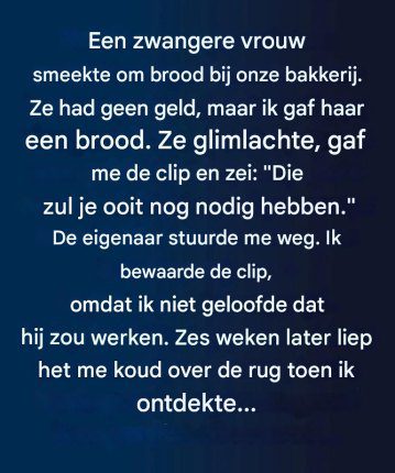 Die dag was de bakkerij stil, zelfs te stil. De zwangere vrouw duwde aarzelend de deur open. Ze vroeg nederig om een brood, maar gaf toe dat ze het zich niet kon veroorloven. Een jonge verkoopster die voor haar stond, Camille, voelde een instinctieve impuls: ze bood haar een nog warm brood aan, puur uit vriendelijkheid. In ruil daarvoor gaf de klant, Élise, haar een klein haarspeldje, een bescheiden voorwerp dat haar met een dankbare glimlach werd overhandigd: « Op een dag zul je het nodig hebben. »