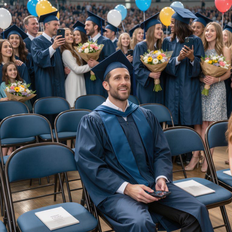 Het helpt meer dan je denkt en het herinnert me eraan dat ik deze momenten niet alleen hoef te delen. Ik liep van het podium af met mijn diploma in mijn hand en een leegte in mijn borst, omdat alle stoelen gereserveerd waren voor mijn familie, mijn vrouw, mijn kinderen. Mijn ouders zaten leeg onder de felle zaalverlichting. Om me heen huilden mensen, omhelsden elkaar en gaven bloemen door aan lange rijen trotse familieleden. Ik stond daar maar alleen, probeerde de pijn te verwerken en deed alsof het me niet kon schelen. Vijf jaar lang late avondlessen, vroege ochtenddiensten en opgeofferde weekenden hadden me naar dit moment gebracht.