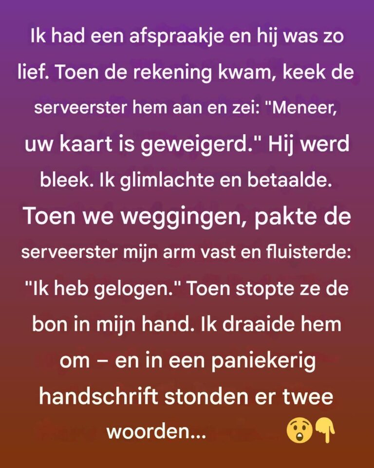 De serveerster stak plotseling haar hand uit en pakte zachtjes mijn arm. Ze boog zich naar me toe en fluisterde: « Ik heb gelogen. »
