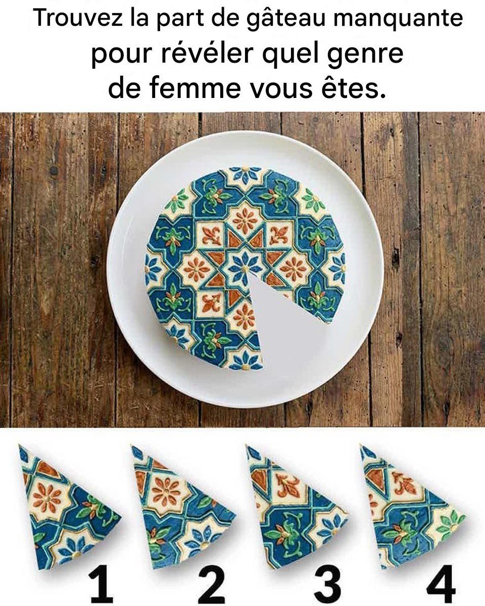 Persoonlijkheidspuzzels gebaseerd op visuele keuzes zijn erg populair geworden omdat ze observatie, intuïtie en een beetje zelfreflectie combineren. De afbeelding hierboven toont een prachtig gedecoreerde taart waarvan één stuk ontbreekt. Daaronder liggen vier mogelijke stukken die in de lege ruimte zouden kunnen passen.