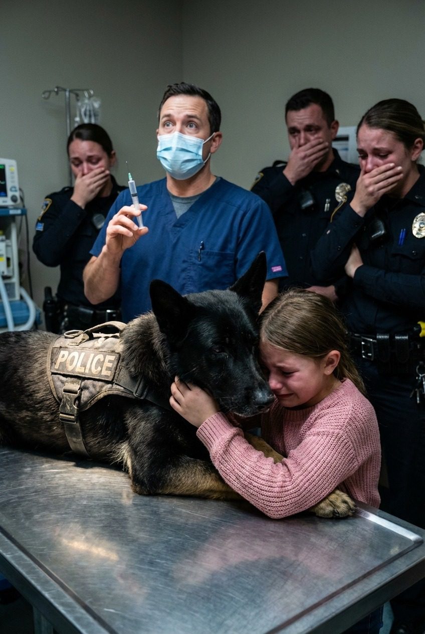 Vlak voordat de terminaal zieke politiehond zou worden ingeslapen, omhelsde hij een klein meisje nog een laatste keer – toen de dierenarts plotseling iets ernstigs opmerkte en de procedure stopzette, waardoor alles op dat moment veranderde.