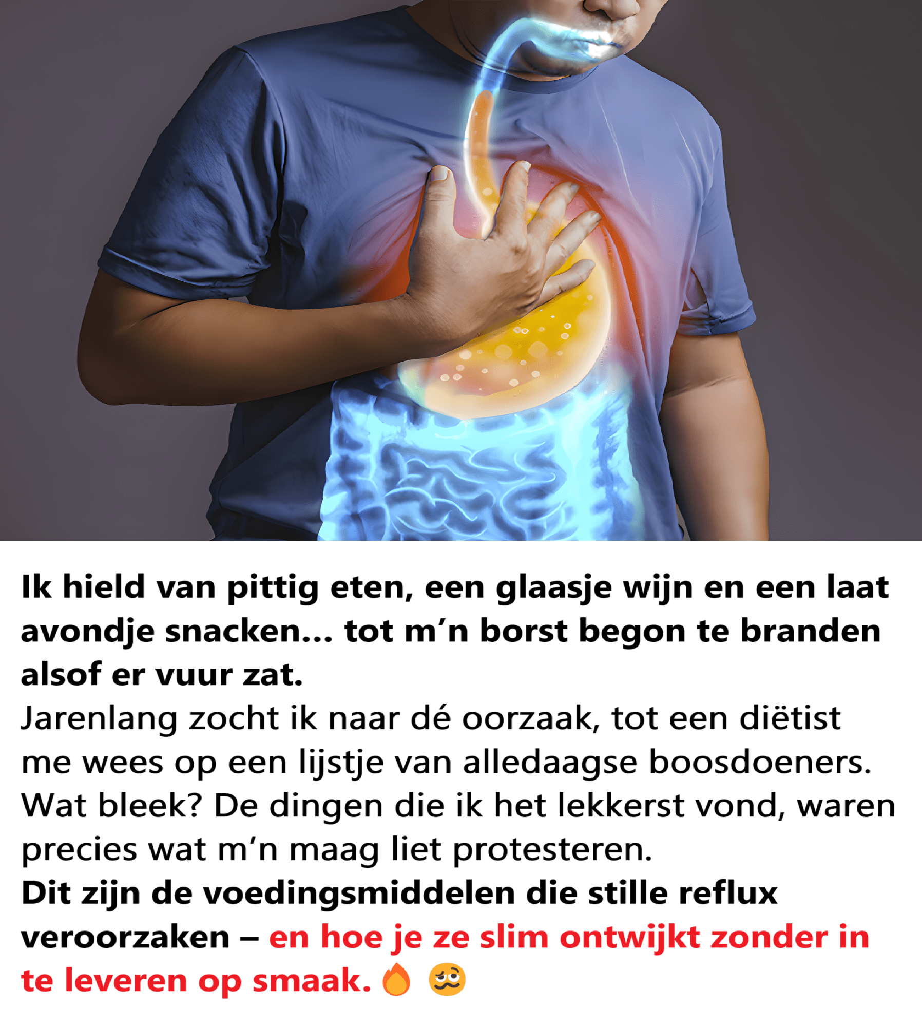 Reflux is een aandoening waarbij maagzuur in de slokdarm opstijgt, wat een branderig gevoel, een bittere smaak en zelfs hoest of een slechte adem veroorzaakt. De oorzaak? Een sluitspier tussen de maag en de slokdarm die iets te ontspannen is , vaak onder spanning door bepaalde voedingsmiddelen.