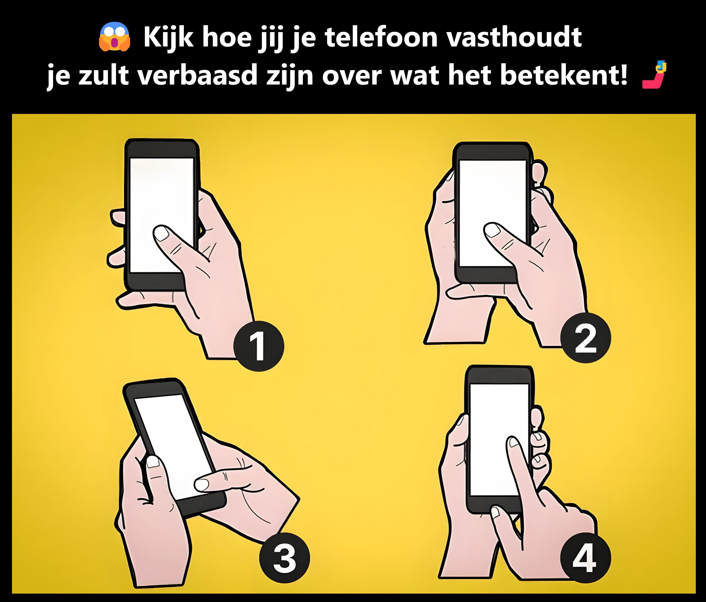 Vergelijk jouw manier van telefoon vasthouden met de onderstaande beschrijvingen en ontdek wat dit onthult over jouw persoonlijkheid! 👇
