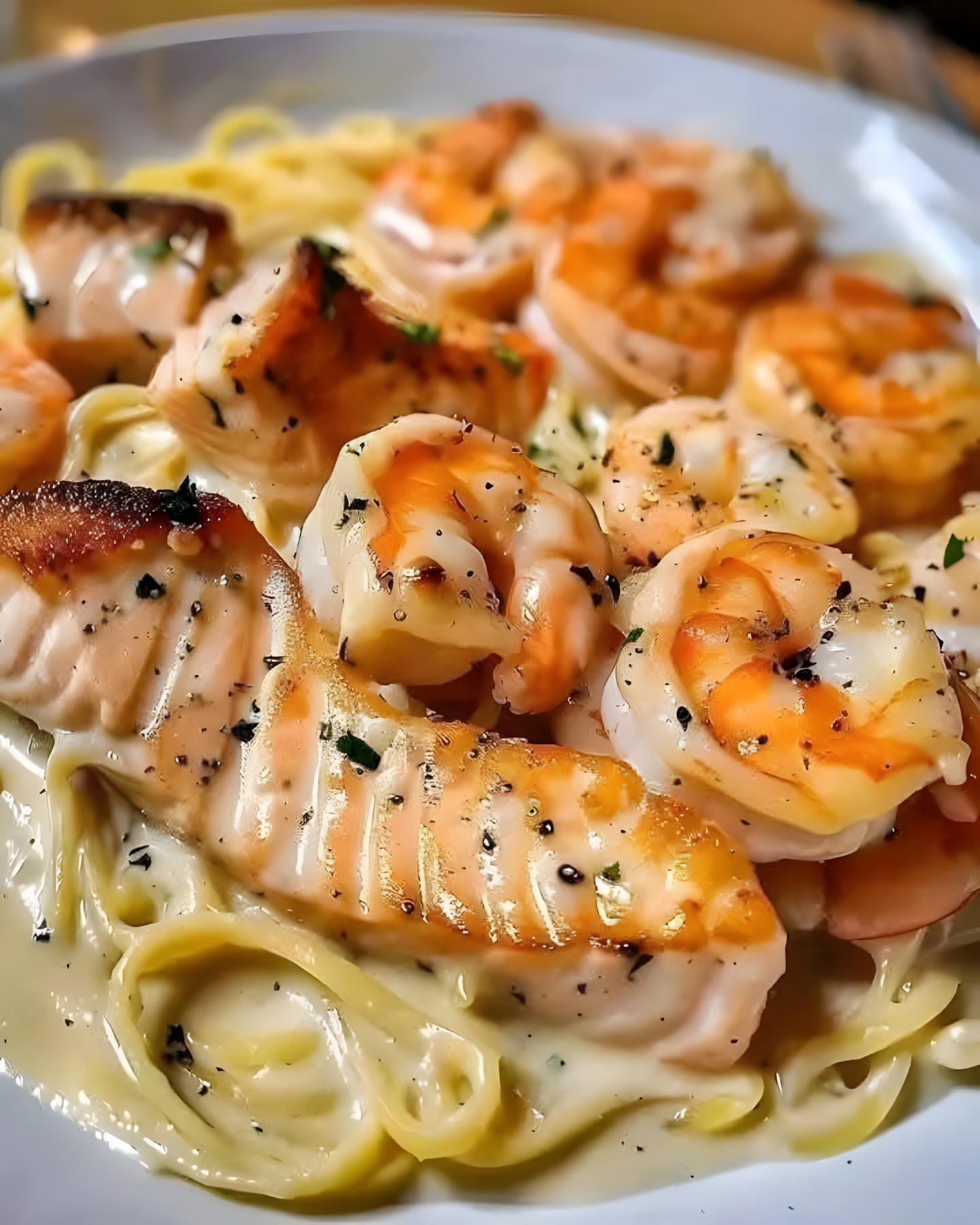 Een rijke, romige en verrukkelijke pasta met zeevruchten, met perfect gebakken zalm en garnalen in een luxueuze Parmezaanse Alfredo-saus. De perfecte comfortmaaltijd voor liefhebbers van zeevruchten! ❤️
