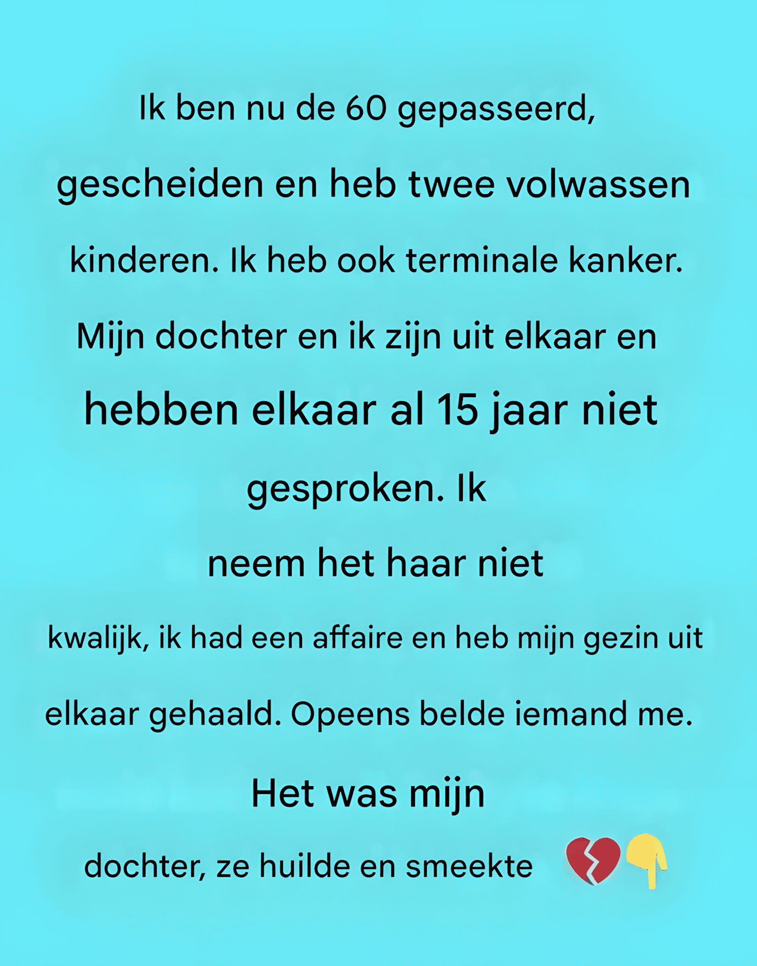 Vijftien jaar. Ze had me zo lang buitengesloten – geen e-mails, geen verjaardagen, geen contact. En nu was ze hier, niet alleen om contact te zoeken, maar me ook nodig te hebben.