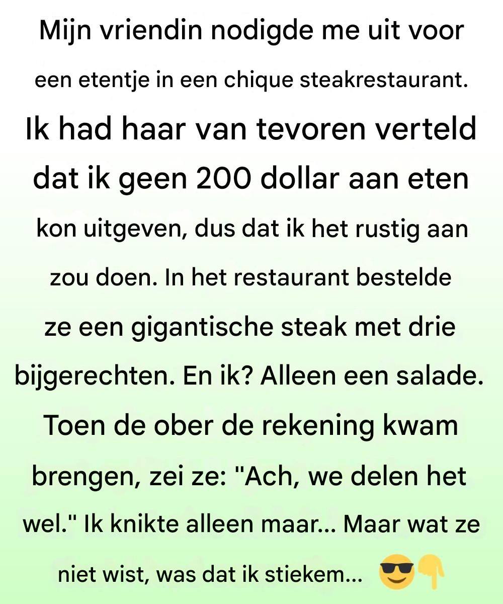 ‘Hé,’ zei ik zachtjes tegen haar, ‘ik kan me op dit moment echt geen diner van 200 dollar veroorloven. Ik bestel wel iets kleins.’