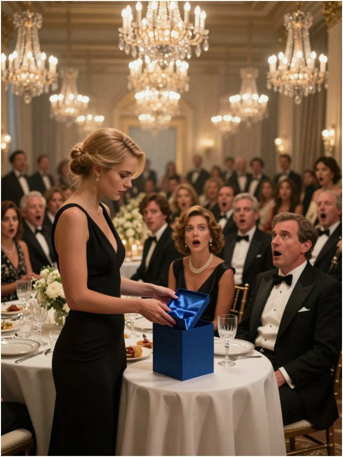 Ik reikte in de doos en zette het fluwelen etui precies in het midden van de tafel – precies waar Richard Hart mijn cadeau had proberen weg te stoppen alsof het afval was. Daarna legde ik er een tweede voorwerp naast: een slanke, elegante map met metalen hoeken, die dichtgeklapt was.