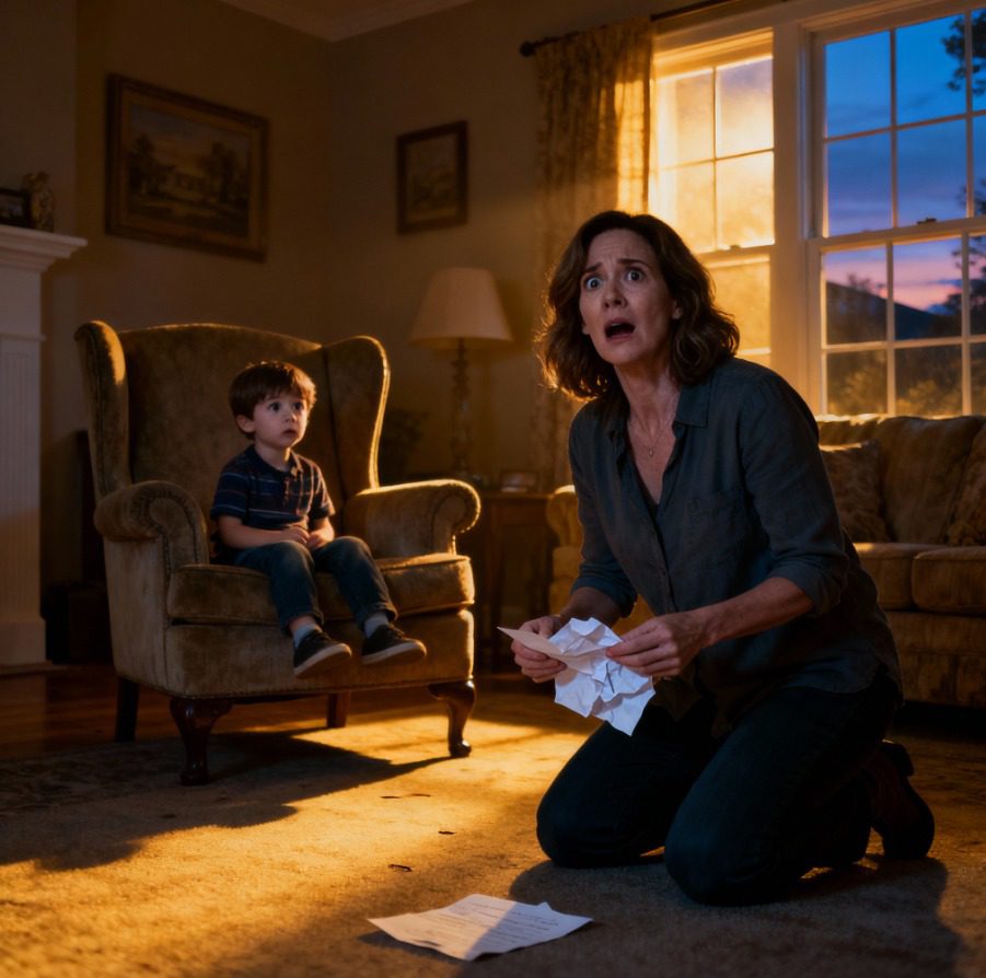En toen zag ik Kyle. Vijf jaar oud, opgerold in een stoel, een kussen tegen zijn borst geklemd. Hij huilde niet. Hij wachtte gewoon. In zijn hand hield hij een verfrommeld briefje.