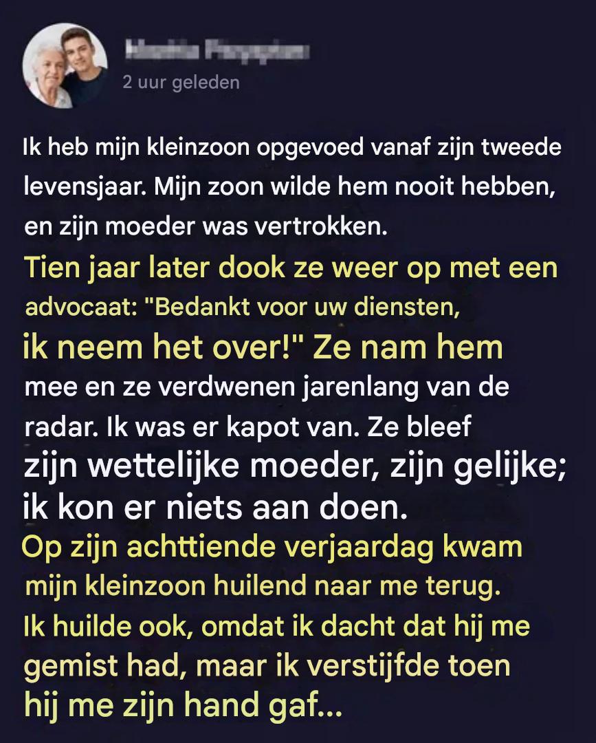 Er zijn banden die niets echt kan verbreken, zelfs tijd, afstand of de beslissingen van volwassenen niet. Sommige verhalen herinneren ons eraan dat de liefde die elke dag wordt gegeven een onuitwisbare indruk achterlaat. Mijn verhaal is bijzonder hartverscheurend, omdat ik mijn kleinzoon opvoedde als mijn eigen kind… totdat hij van me werd afgenomen. Jarenlang leefde ik in stilte en afwezigheid, tot de dag dat er iemand op mijn deur klopte.